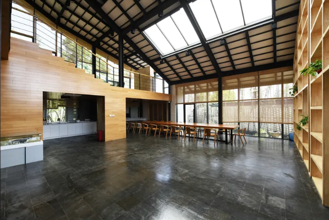 其次,对于原本质量很差的附属用房,原来的厨房、杂物房等等,进行了新的规划。驻场团队需要较大的工作空间,于是采取了“大庇天下寒士俱欢颜”的策略,将院落覆盖起来,为了减少大屋面对乡村机理的影响,采用了三处折叠的方式,化解大屋面的体量。同时为了诚实地表达新建部分,这个屋面才用了全新的钢结构和金属瓦,这一点和昆曲学社采用了同样的处理手法。大屋顶的南侧保留了一处小小的院落,为了提高采光,才用了双层花砖墙。大屋顶的西侧是一个敞院儿,也是入口之处,此处是放农具的地方,亦可放置电动车或自行车,总之,房子的附属部门充分满足了“新村民们”生产的需要。