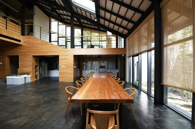 关于建筑的室内,完全是全新植入的设计方法,二楼的老走廊变成了工作台,新建的厨房上面是开沙龙的小剧场,而沙龙台阶的下面,是空调的出风口,竹匠们在竹地板上一个一个手工开凿了空调的出风口。新老房子的交界处清晰可见,见证着两栋建筑之间的有机生长。而整个设计再次把新项目织补到了新浜村的机理中,风景依旧如画,小桥偎依人家,原来几乎已经被放弃的老村子,再次注入了新的生命。
